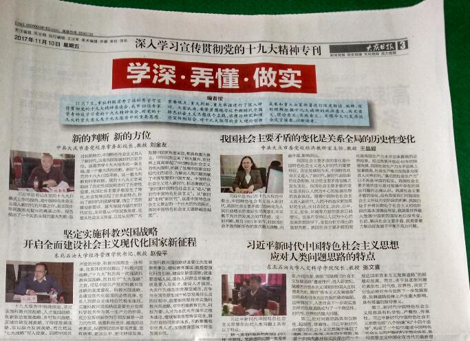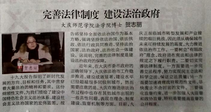 2017年11月7日下午,大庆社科联召开了社科界学习、宣传和贯彻党的十九大精神座谈会,公司贺志丽博士应邀参加,并做了题为“迎难而上 建设法治政府”的主旨发言。发言内容修改提炼后,以“完善法律制度 建设法治政府”为题发表在11月10日出版的《大庆日报》“深入学习宣传贯彻党的十九大精神专刊”。