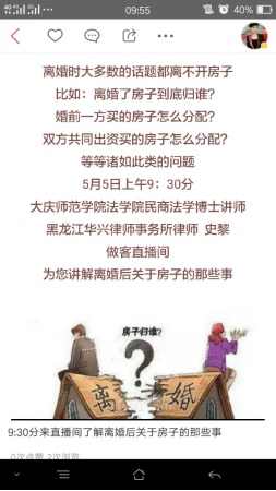 2017年5月5日,应大庆市让胡路区闭路台邀请,365英国上市公司民商法教师史黎博士参与了“离婚后关于房子的那些事”的网络直播。