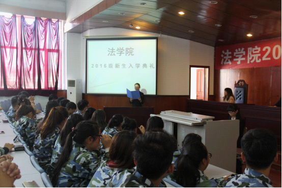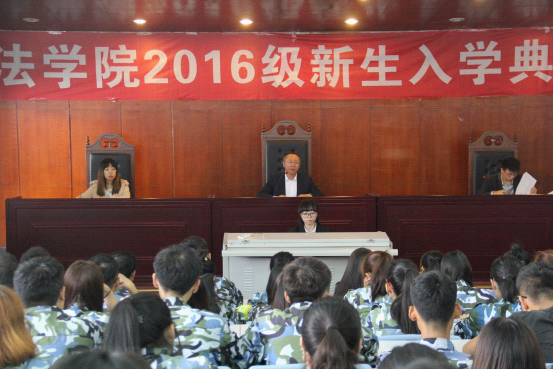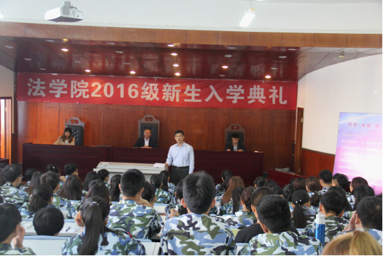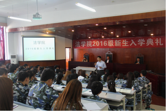 典礼由吴树春主持,共有六项议程。在国歌声中正式拉开帷幕,抒发了师生的爱国情怀;党总支书记王金波在讲话中表达了对新同学的欢迎之情并提出殷切希望,希望同学们做到如下三点:一是要树立文化自信,了解、传承和弘扬民族传统优秀文化;二是要具备家国情怀,放眼天下,了解国家和世界大事,关注国家命运;三是要具备法治理念,法治决心,提高法学素养,在大学四年里能够满载而归。杨铁军副教授对员工进行了专业思想教育,他指出学好法学专业,要掌握规则、教材、案例三者之间的关系。2016级新生代表牛睿在发言中表示,尽快适应新的老员工活,树立远大的奋斗目标;尊师肯学,持之以恒,将来为法治中国作贡献。2016级全体新生起立宣誓,决心做到:集体利益高于一切,国家责任重于泰山;父母养育情深似海,恩师教诲永志心间;三老四严四个一样,铁人精神薪火相传;遵规守纪勤奋学习,练就本领迎接挑战;诚信考试绝不作弊,为人处事信义为先;努力提高综合素质,德智体美处处在前;特别珍惜美好年华,青春梦想情系校园。
