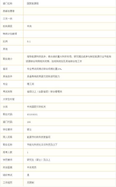 2011年国家公务员考试竞争比例最热的职位是国家能源局能源节约和科技装备司节能与科技处主任科员及以下,达4961:1,出现了近五千人争一职位的现象。