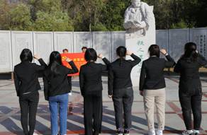 为迎接祖国70周年华诞,抒发中华儿女对祖国真挚的情感,进一步激发党员的爱国情怀,员工党支部开展“我与国旗合影”活动。活动过后,在铁人王进喜雕像前,党员们郑重地举起右手,他们庄严的宣读入党誓词。那一刻,他们目光坚毅而深邃,声音庄重而洪亮;那一刻,铮铮誓言穿越时空,在庆师上空回荡。