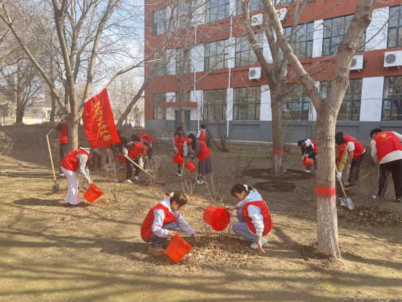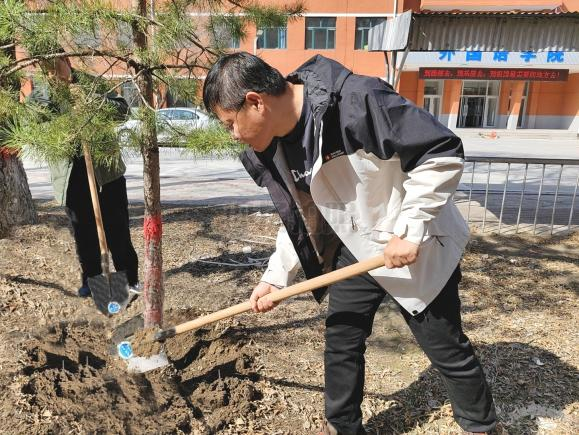 志愿服务现场,师生分工协作,配合默契,用行动践行“人人爱绿、植绿、护绿”的文明风尚。教师党员手拿铁锹,挖坑培土、压实固根,员工身穿红色马甲,提桶浇水,扶苗填坑,有条不紊地劳作。现场劳动氛围火热,秩序井然,师生共同努力为校园增添一抹亮丽的春色。