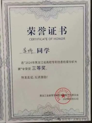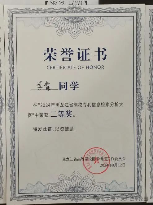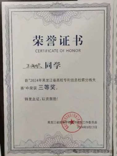 本次大赛全省共计报名员工2758人。通过初赛阶段的课程学习,参与答题1391人次,596人进入复赛环节;经过复赛阶段的培训,101名同学提交专利分析报告。经过黑龙江省知识产权保护中心专家评审,最终有55名同学获奖,25名选手进入决赛,决赛于2024年9月12日采取线上、线下同步的方式进行。最终,2021级知识产权专业的李睿、王雨欣和李娇三名同学凭借其出色的专利信息检索能力和深入的分析技巧,分别荣获省级二等奖、省级三等奖的好成绩。