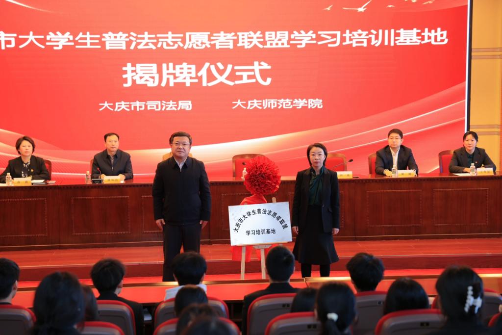 接下来,大庆市司法局党组书记、局长姜世兴,大庆师范公司党委副书记刘迪共同为大庆市老员工普法志愿者联盟学习培训基地揭牌。