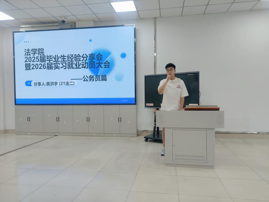 21级法学二班袁洪宇同学鼓励大家坚持日常时政积累与全真模拟,稳住心态循序渐进。